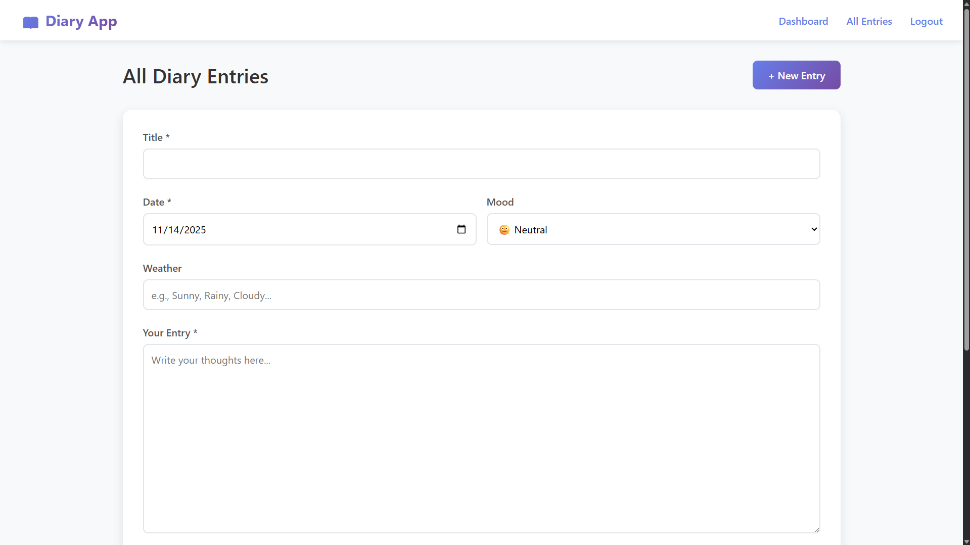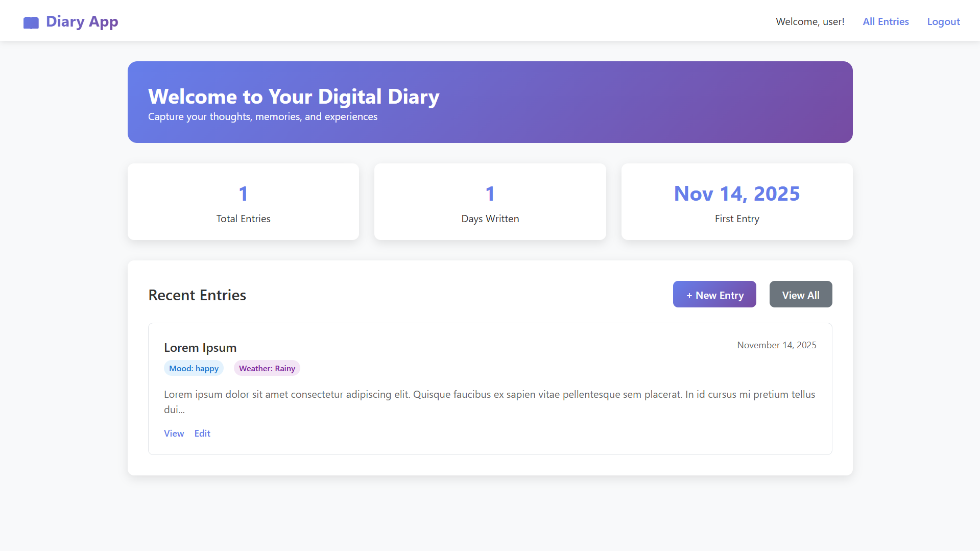 Welcome to your new digital sanctuary for personal reflection and memory keeping. Our Diary App provides a secure and intuitive platform where you can capture life's moments, express your thoughts, and preserve your memories in a beautifully organized digital space. Built with modern web technologies, this application offers a seamless journaling experience that combines the timeless tradition of diary writing with the convenience of digital accessibility. Whether you're documenting daily experiences, tracking your emotional journey, or simply preserving precious memories, this app serves as your personal digital confidant, available whenever inspiration strikes.