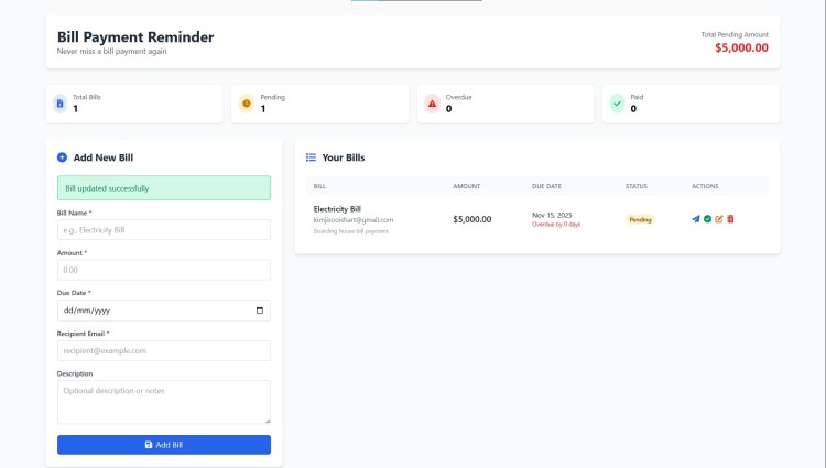 This powerful tool goes beyond simple tracking by incorporating automated email notifications that keep both you and your recipients informed about upcoming and overdue payments. With real-time status updates, visual indicators for payment urgency, and secure database operations, our system transforms how you handle bill management. Whether you're managing personal utilities, business invoices, or recurring subscriptions, this application offers the reliability and professionalism needed to maintain perfect payment records and strengthen your financial organization.