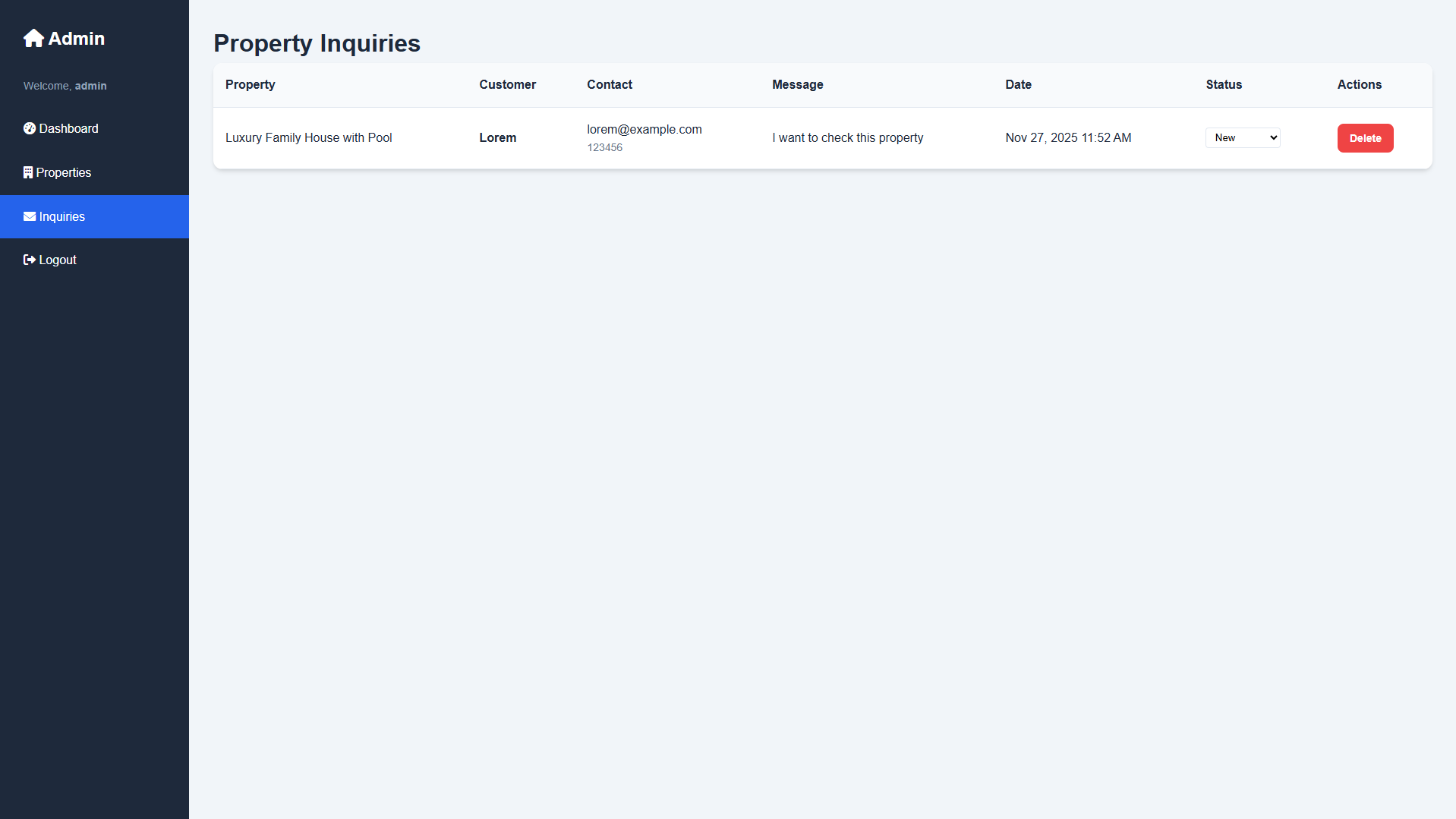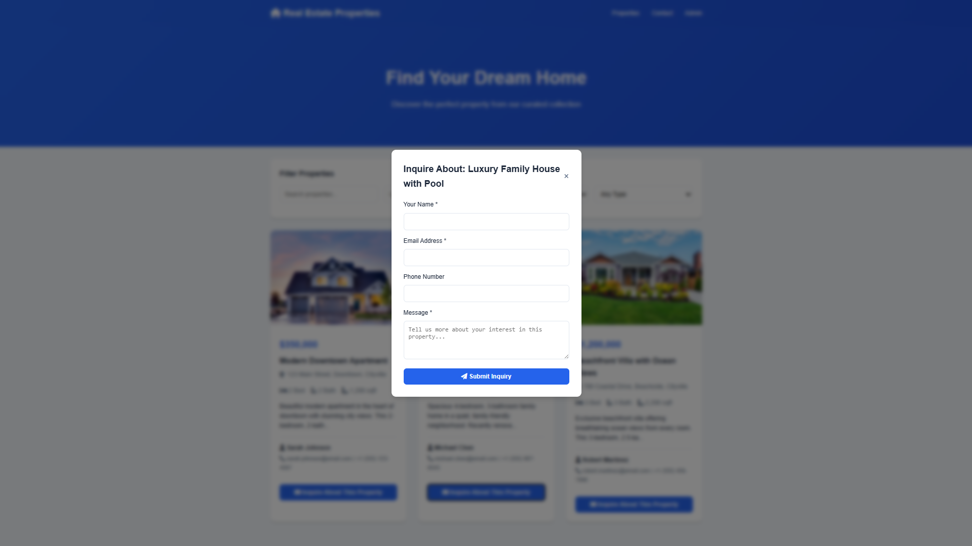 Our application features a responsive design that ensures optimal viewing across all devices, from desktop computers to mobile phones. Property seekers can effortlessly browse through listings, utilize advanced filtering options, and submit inquiries directly through interactive modal forms. Meanwhile, administrators benefit from a secure dashboard that provides complete control over property management, customer communication tracking, and real-time analytics. This dual-focused approach creates an exceptional experience for both end-users and management, making it the ideal choice for real estate agencies, property managers, and individual sellers looking to maximize their property's online presence.