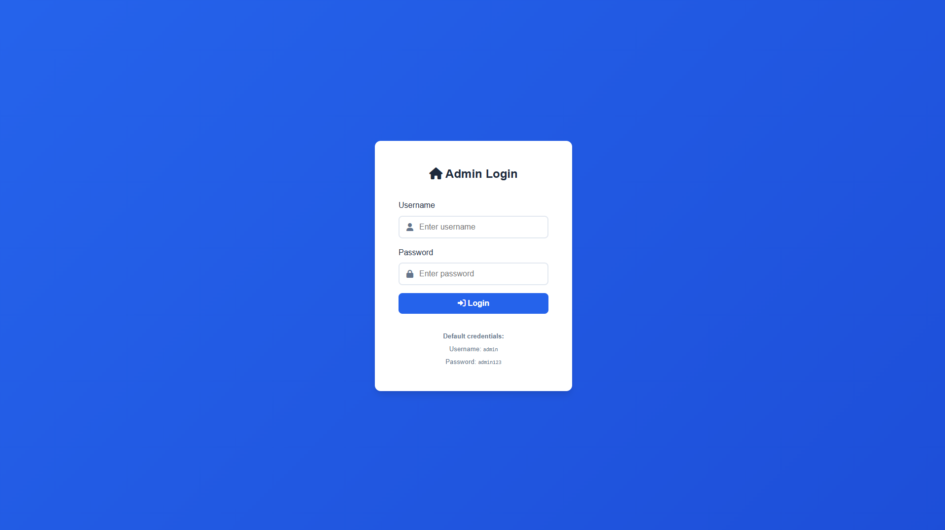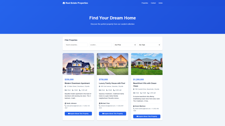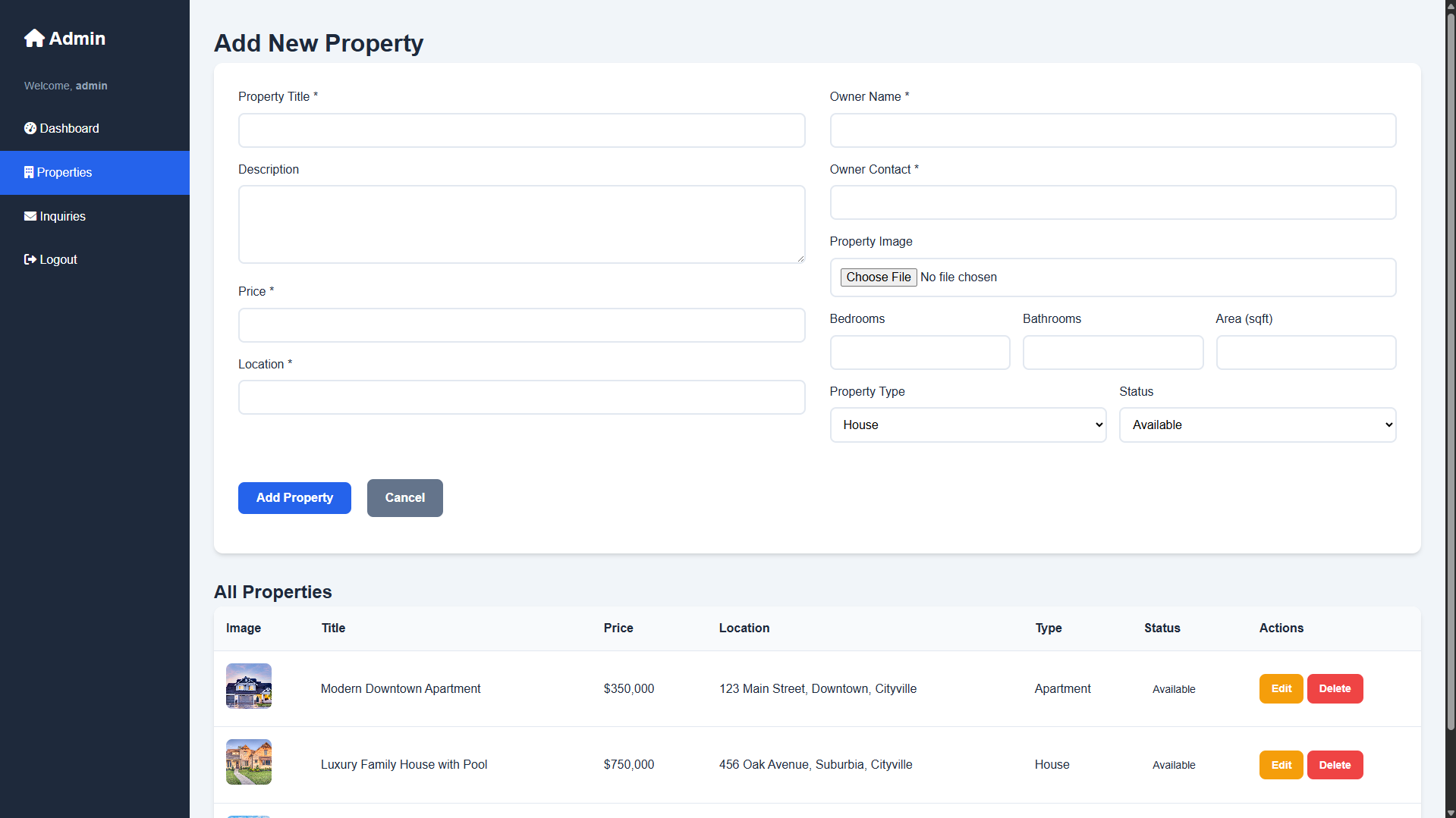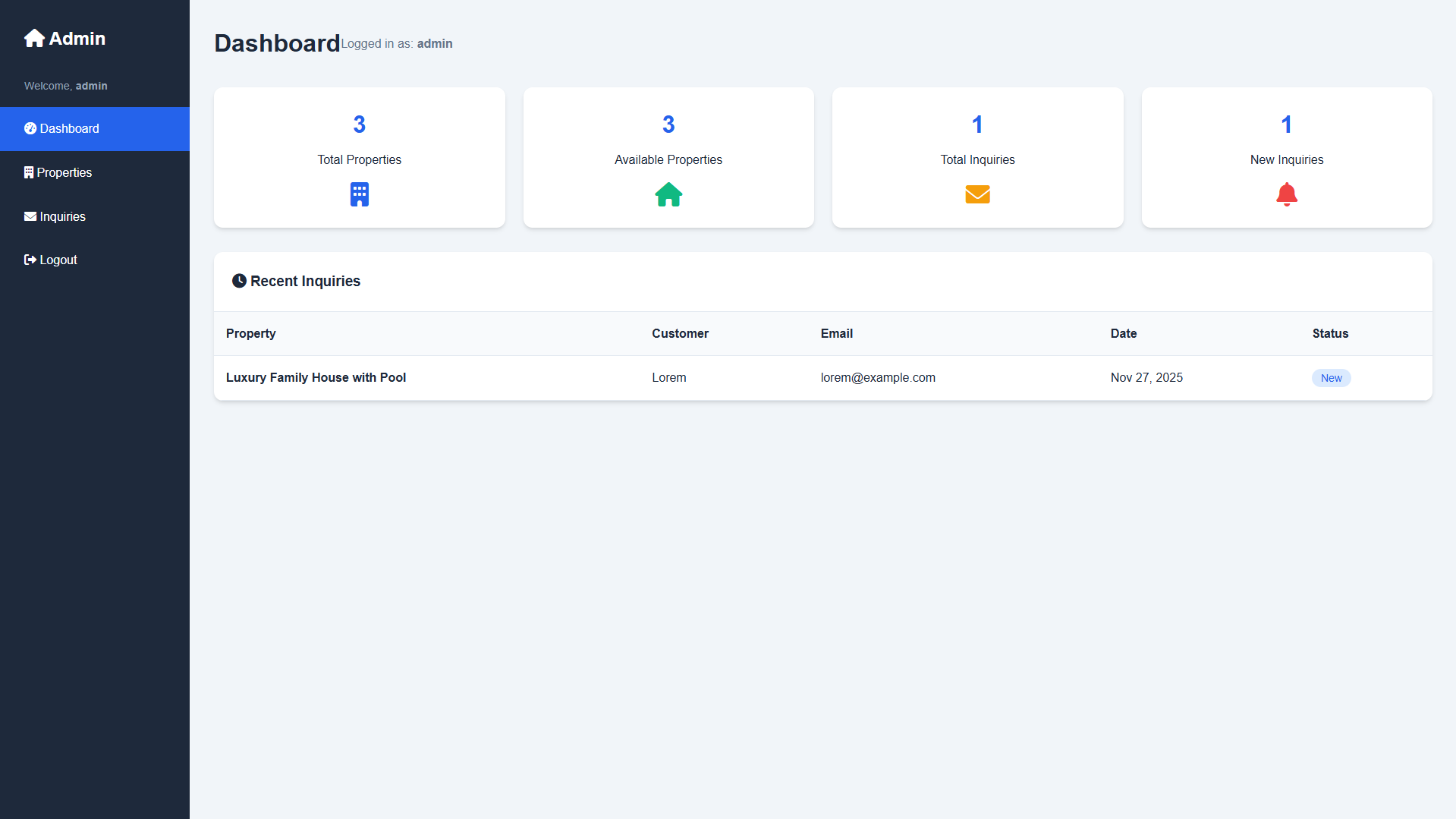 /admin/login.phpwith credentials admin/admin123.Add properties through the admin property management section.