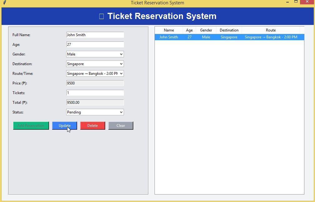 The Ticket Reservation System Using SQLite and Tkinter in Python is a comprehensive desktop application designed to simplify the process of managing ticket bookings. Built with Python's Tkinter library, it provides a user-friendly graphical interface that allows users to easily create, view, update, and delete reservations. All reservation data is securely stored in an SQLite database, ensuring reliability and efficient data management. The system also includes features such as searching for specific bookings, exporting records for reporting purposes, and validating inputs to prevent errors. Ideal for small businesses or transport services, this application streamlines ticket handling, reduces manual paperwork, and enhances overall booking efficiency.