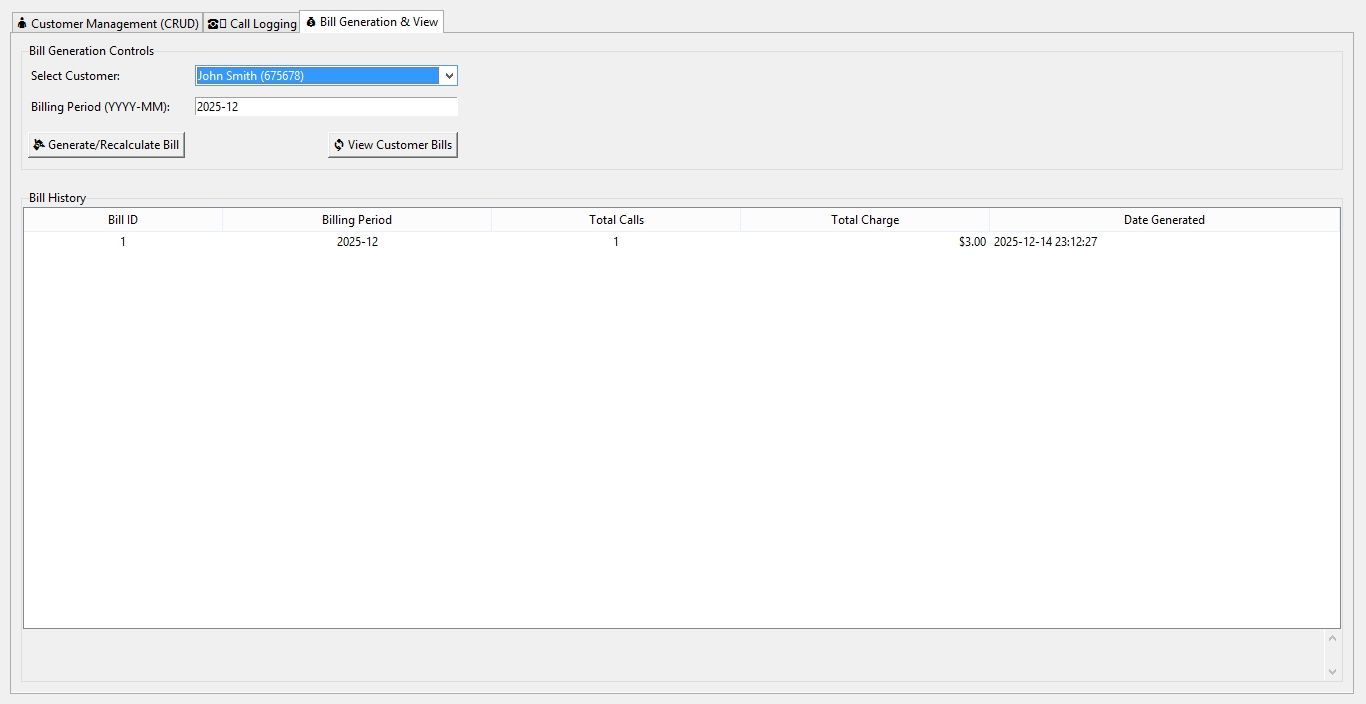 - Easy navigation with buttons for generating, viewing, and managing bills.