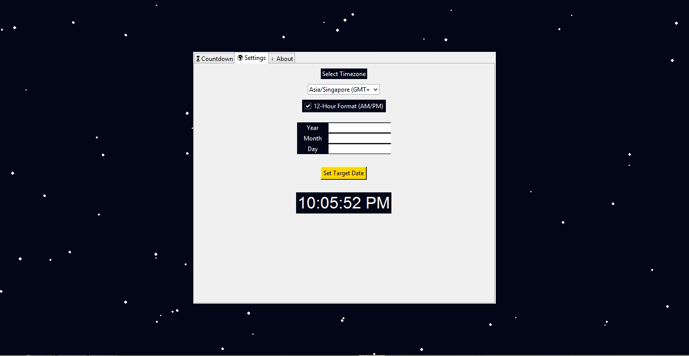 The New Year Countdown App is an interactive desktop application built entirely with Python using the Tkinter library. The application is simple and allows the user to set a countdown timer. The New Year Countdown App Using Tkinter includes tools that let you set your own countdown timer and adjust the timezone. This project is an excellent way to practice and reinforce essential programming concepts, making it a valuable exercise for enhancing your Python skills in application development.