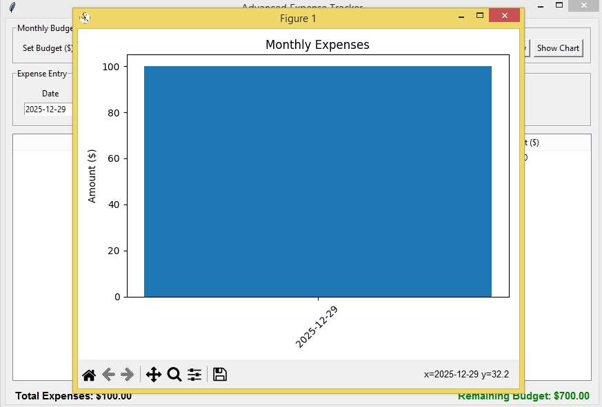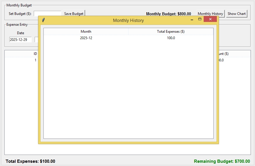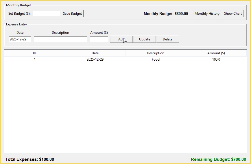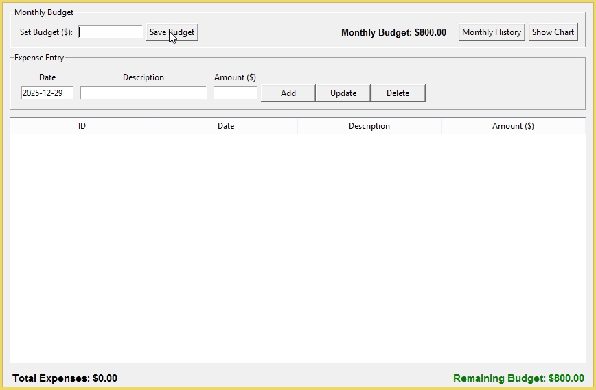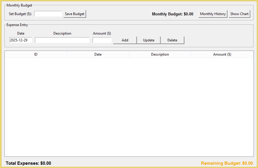 The Daily Expense Tracker App is an interactive desktop application built entirely with Python using the Tkinter library. The application is simple and allows the user to manage and track their expenses. The Daily Expense Tracker App includes tools that let you set and monitor your budgeting expenses. This project is an excellent way to practice and reinforce essential programming concepts, making it a valuable exercise for enhancing your Python skills in application development.