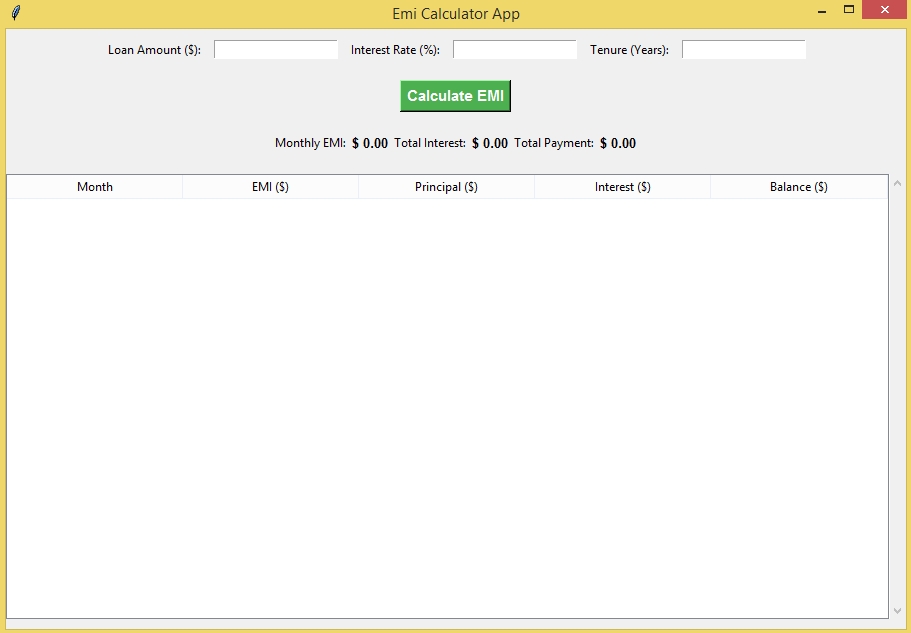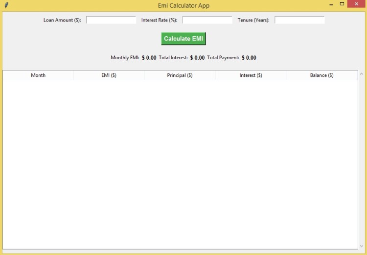 The EMI Calculator App is an interactive desktop application built entirely with Python using the Tkinter library. The application is simple and allows the user to calculate EMI based on given loan details. The EMI Calculator App Using Tkinter includes tools that provide a full breakdown of the EMI calculation. This project is an excellent way to practice and reinforce essential programming concepts, making it a valuable exercise for enhancing your Python skills in application development.