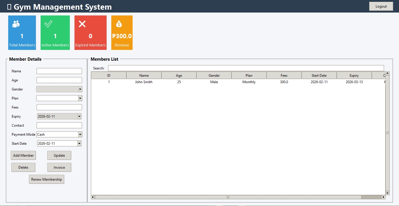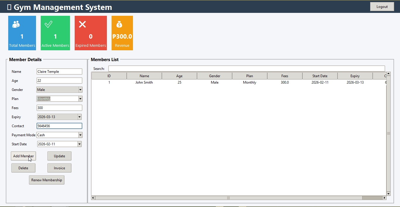 - Search and filter members by name, membership type, or status.