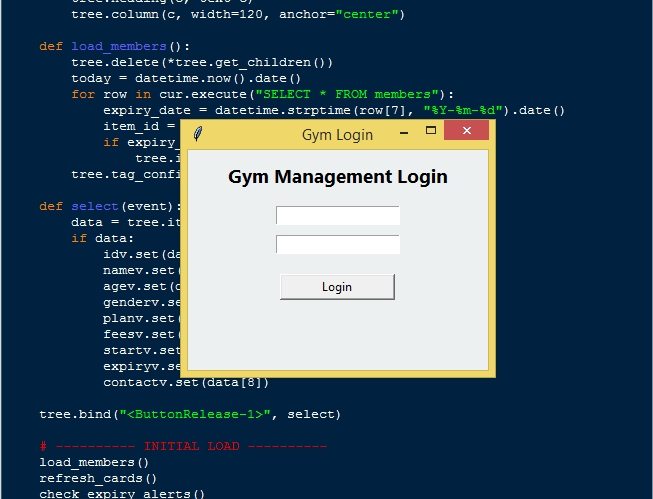 The Gym Management System is an interactive desktop application built entirely with Python using the Tkinter library. The application is simple and allows users to manage gym memberships. The Gym Management System Using Tkinter and SQLite includes tools that let you create, track, and monitor gym memberships and associated gym activities. This project is an excellent way to practice and reinforce essential programming concepts, making it a valuable exercise for enhancing your Python skills in application development.