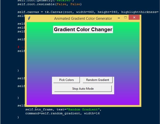 The Animated Gradient Color Changer App Using Tkinter in Python with Source Code is free to be downloaded just read the content below for more info. This application is for educational purpose only.