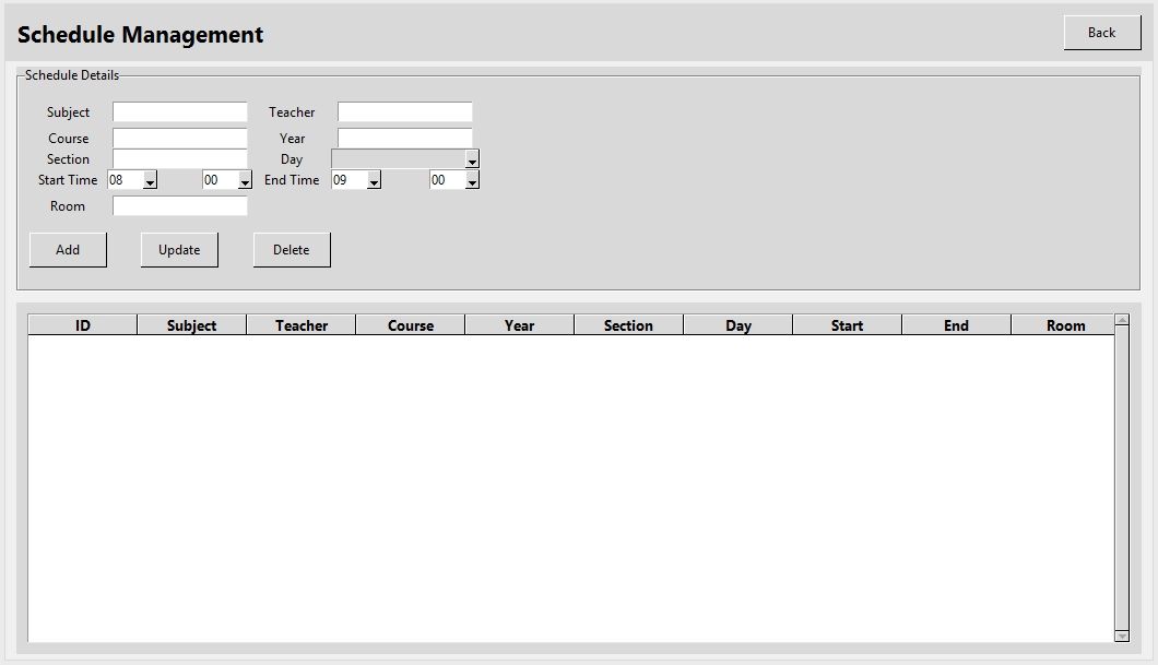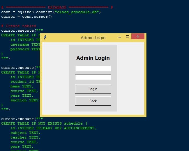 The Class Scheduling System is a comprehensive desktop application developed using Tkinter for an intuitive graphical user interface and SQLite as the backend database for secure and efficient data storage. This system allows administrators to seamlessly manage class schedules by adding, updating, or deleting courses, assigning instructors, and organizing timetables by day, time, course, year, and section. Students can conveniently view their schedules simply by entering their student ID, without the need for a username or password, making it easy to stay informed about their classes. By centralizing schedule management, the system minimizes conflicts, improves organization, and enhances overall efficiency for both staff and students. Its user-friendly interface and robust database integration make it a practical tool for educational institutions aiming to streamline academic scheduling.