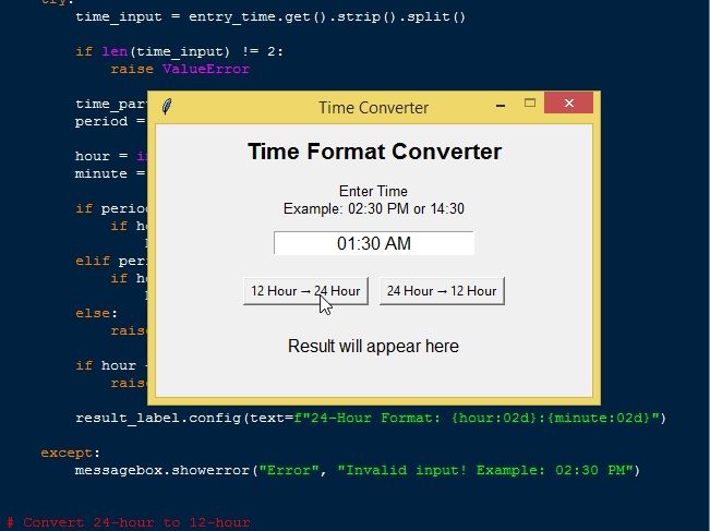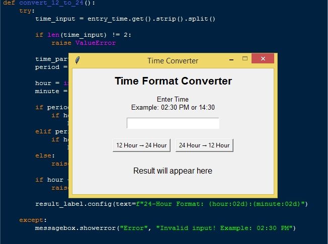Beyond its practical use, the Time Converter App also serves as a valuable learning project for programmers who are exploring Python GUI development. It demonstrates important programming concepts such as event-driven programming, user input handling, conditional logic, and time manipulation. Additionally, it shows how Tkinter widgets like labels, entry fields, and buttons can be combined to create an interactive application. Overall, this project provides a great hands-on experience for learners who want to strengthen their understanding of Python while building a functional and visually interactive tool.