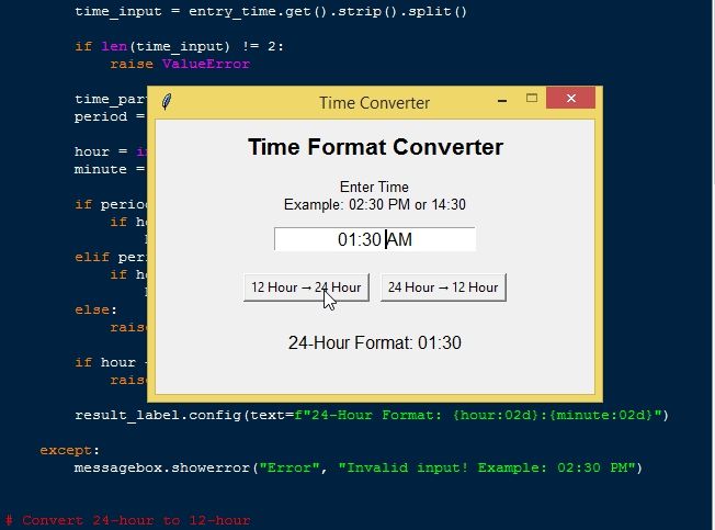 The Time Converter App Using Tkinter is a user-friendly desktop application developed in Python that converts time between the 12-hour format and the 24-hour format using a graphical interface. The application is built with the Tkinter library, which allows developers to create simple yet functional GUI-based programs. In this app, users can easily enter a time value and choose the type of conversion they want to perform. Once the input is provided, the program processes the data and instantly displays the converted time in the selected format. This eliminates the need for manual calculation and helps users quickly understand how time representation works in different systems.
