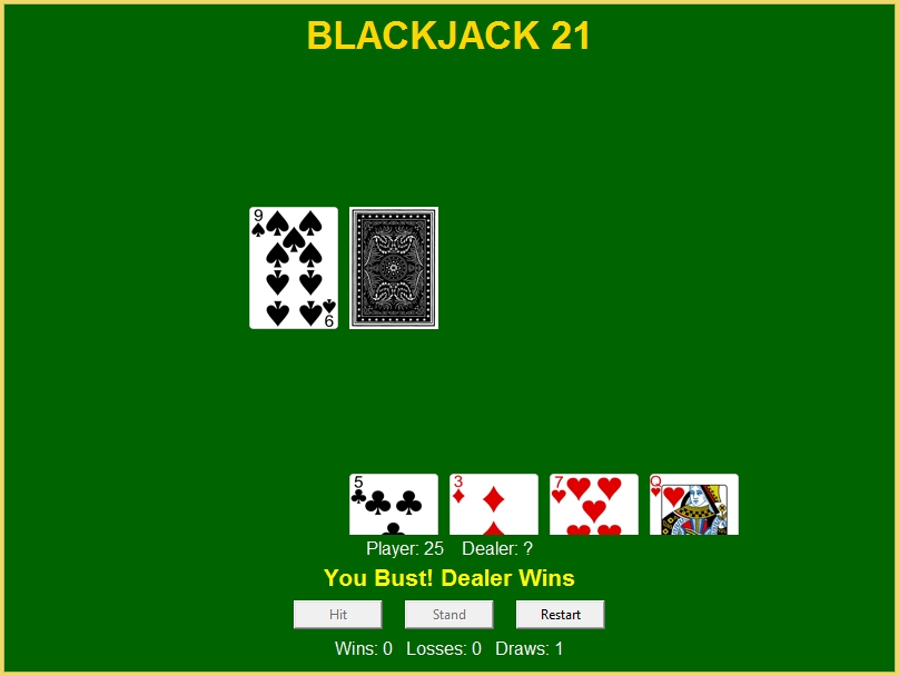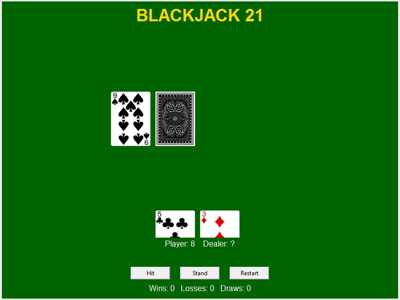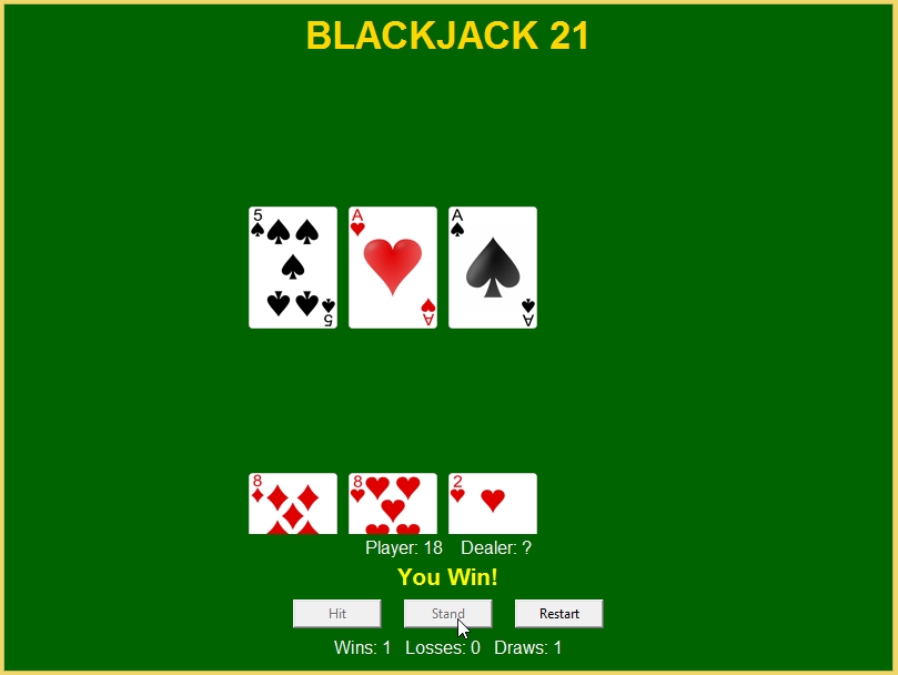- Buttons for Hit, Stand, Deal, and Restart actions.