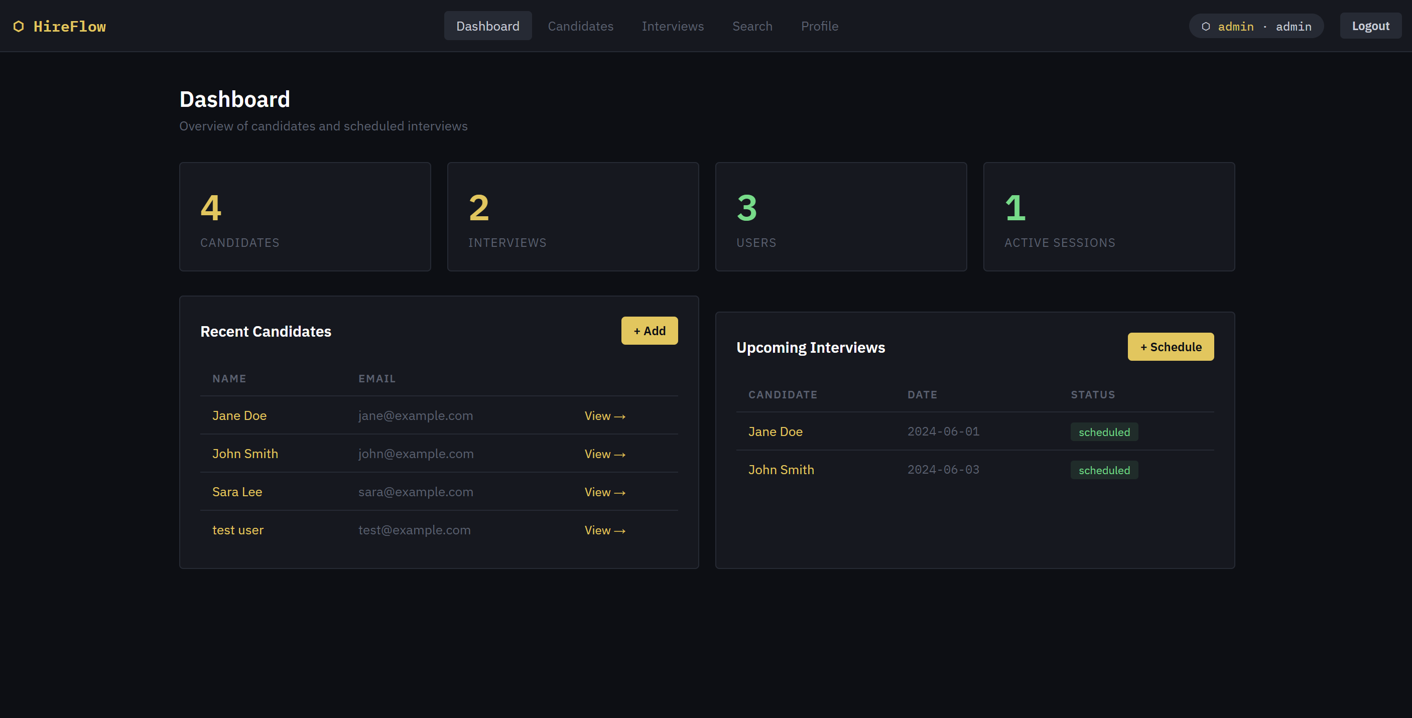 With its clean dark-themed interface and simple navigation, HireFlow ensures a comfortable user experience while keeping all recruitment tasks structured and efficient.