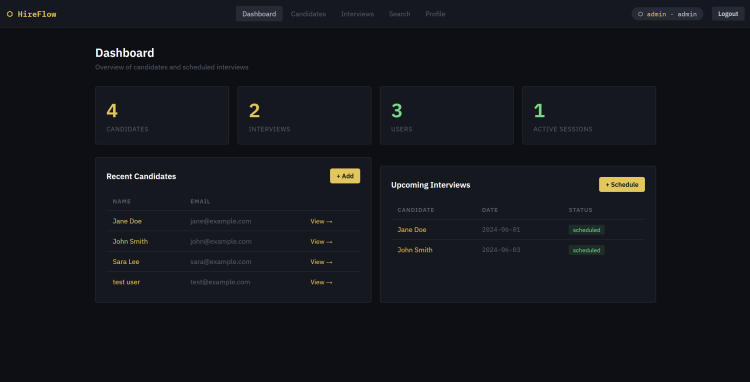 HireFlow features a modern dark-themed design that is both stylish and practical. The responsive layout ensures that the system works well on desktops, tablets, and mobile devices.