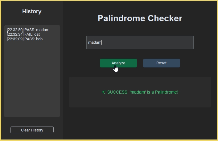 - Ignores letter casing (e.g., “Madam” = palindrome).