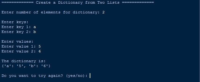 - print("\n============= Create a Dictionary from Two Lists =============\n")
