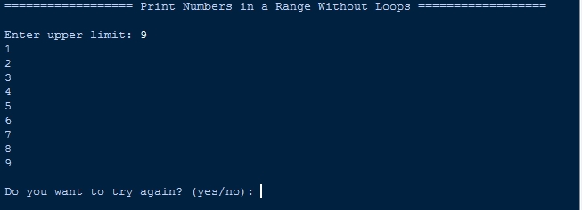 - print("\n================== Print Numbers in a Range Without Loops ==================\n")