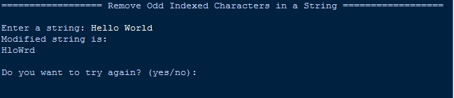 This topic is straightforward to understand. Simply follow the instructions provided, and you will complete it with ease. The program will guide you step by step through the process of removing characters at odd indices. So, let’s dive into the coding process!