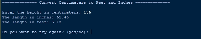 This Python program converts a user-provided height in centimeters to both feet and inches. The user is prompted to enter a value in centimeters, which is then multiplied by the appropriate conversion factors (0.394 for inches and 0.0328 for feet). The converted values are rounded to two decimal places and displayed. After showing the result, the program asks whether the user wants to perform another conversion or exit.