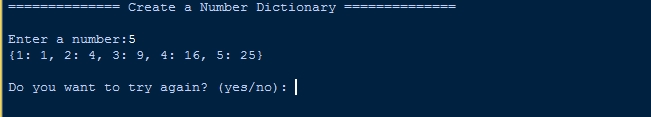 This Python program creates a number dictionary based on a user-defined range. It prompts the user to enter a number `n` and then uses a dictionary comprehension to generate a dictionary where each key is a number from 1 to `n`, and each corresponding value is the square of that number. The resulting dictionary is displayed on the screen. The program runs inside a loop, allowing users to generate new dictionaries repeatedly until they choose to exit.