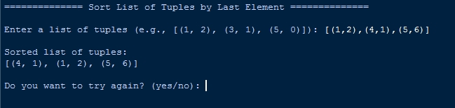 This Python program sorts a list of tuples based on the last element of each tuple. It asks the user to input tuples in Python list format (e.g., `[(1, 2), (3, 1), (5, 0)]`), then uses the built-in `sorted()` function with a custom key function (`last()`) to perform the sorting. The program validates the input to ensure it’s a proper list of tuples and displays the sorted result. It repeats the process until the user decides to exit.