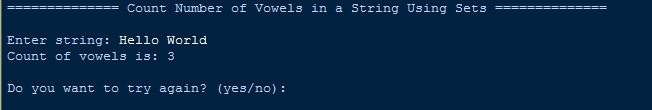 - print("\n============== Count Number of Vowels in a String Using Sets ==============\n")