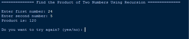 This topic is straightforward and easy to understand. Simply follow the instructions provided, and you’ll complete it with ease. The program will guide you step by step through the process of finding the product of two numbers using recursion. So, let’s dive into the coding process!