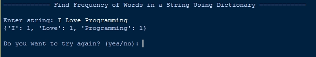 - print("\n============ Find Frequency of Words in a String Using Dictionary ============\n")