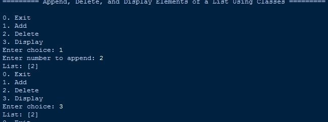 - print("\n========= Append, Delete, and Display Elements of a List Using Classes =========\n")