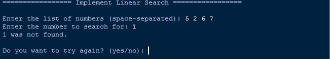 This program implements the Linear Search algorithm to find a specific element in a list. The user enters a list of numbers and a key value to search for. The program sequentially checks each element in the list until the key is found or the list ends. If the key exists, its index position is displayed; otherwise, a message indicates that the element was not found. The program allows repeated searches and exits cleanly based on user choice.
