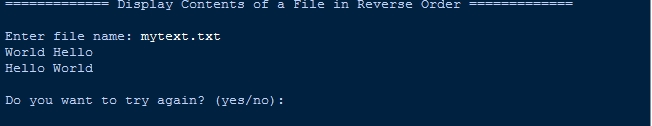 This program reads a text file and displays its contents in reverse order, line by line. It prompts the user to enter a filename, opens the file in read mode, and uses reversed line reading to print the last line first. If the file does not exist, an error message is shown. After execution, the program asks the user whether they want to run it again and continues until the user chooses to exit.