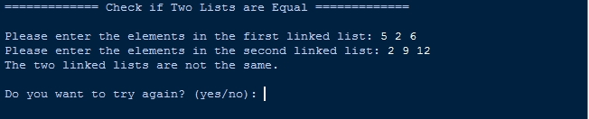 This program compares two singly linked lists to check if they are identical. Users input elements for both lists, and the program traverses them node by node, comparing data values. If all corresponding nodes match and both lists are of the same length, it reports that the lists are the same; otherwise, it indicates they are different. Users can repeat the process or exit.