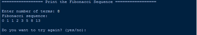 - print("\n================= Print the Fibonacci Sequence =================\n")