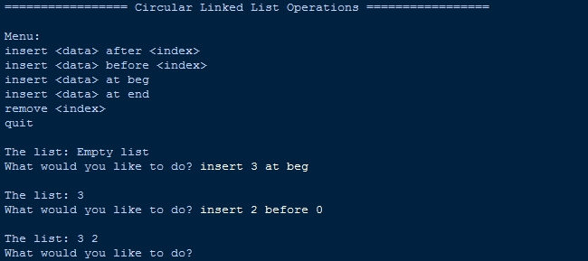 This program demonstrates a menu-driven implementation of a Circular Linked List in Python, allowing users to perform dynamic insertion and deletion operations. It defines a `Node` class to store data and a `CircularLinkedList` class that manages node connections in a circular manner, where the last node points back to the head. The program supports inserting new nodes at the beginning, at the end, before a given index, or after a given index, as well as removing a node at a specified index. Users interact with the list through clear text-based commands, and the current state of the list is displayed after each operation. The outer loop allows the entire program to be restarted or exited, making it interactive and suitable for understanding circular linked list behavior and pointer manipulation.