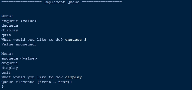 This program demonstrates a simple queue implementation using a Python list and provides a menu-driven interface for interacting with it. The `Queue` class includes basic operations such as checking whether the queue is empty, adding elements to the rear using `enqueue`, removing elements from the front using `dequeue`, and displaying the current contents of the queue in FIFO order. The main loop allows users to repeatedly perform these operations through text commands, showing how elements move through the queue from front to rear. The program continues running until the user chooses to quit, making it a clear and practical example of how a queue data structure works.