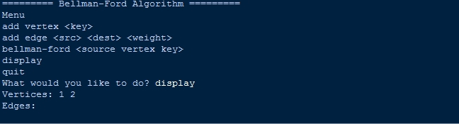 - print("bellman-ford <source vertex key>")