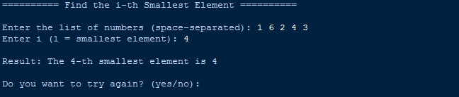 This Python program implements the Quick Select algorithm to find the *i-th smallest element* in a list. It uses a recursive `select` function along with a `partition` method to efficiently narrow down the search by partially sorting the list around a pivot. The program runs in an interactive loop where users input a list of integers and a value `i`, then it validates the input and returns the corresponding i-th smallest element. After each execution, the user can choose to repeat the process or exit the program.