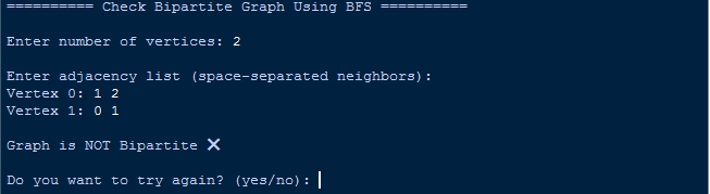 This Python program checks whether a graph is bipartite using Breadth-First Search (BFS). It defines an `is_bipartite` function that uses a queue to traverse the graph and assigns alternating colors to adjacent vertices, ensuring no two connected vertices share the same color. The user inputs the number of vertices and their adjacency lists, and the program evaluates each connected component of the graph. If a conflict in coloring is found, the graph is not bipartite; otherwise, it is bipartite. The program runs interactively, allowing users to test multiple graphs until they choose to exit.