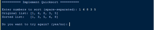 This Python program implements Quicksort, a divide-and-conquer sorting algorithm that recursively partitions a list into elements less than, equal to, and greater than a chosen pivot. It defines a `quicksort` function that sorts the list by combining the sorted sublists. The program runs interactively, allowing users to input a list of integers, display the original list, and view the sorted result. It also includes input validation and a loop that lets users repeat the process or exit.