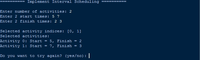 This Python program implements the Interval Scheduling algorithm using a greedy approach to select the maximum number of non-overlapping activities. It sorts activities based on their finish times and iteratively chooses activities whose start time is greater than or equal to the finish time of the last selected activity. The program runs interactively, allowing users to input start and finish times for activities, then outputs the indices and details of the selected optimal set. It also includes input validation and a loop for repeated execution or exit.