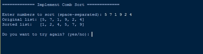 This Python program implements Comb Sort, an improved variation of Bubble Sort that eliminates small values near the end of the list more efficiently by using a shrinking gap between compared elements. It repeatedly compares and swaps elements that are a certain gap apart, gradually reducing the gap until it becomes 1, at which point it behaves like Bubble Sort. The program runs interactively, allowing users to input a list of integers, view the original list, and see the sorted result. It also includes input validation and a loop that lets users repeat the process or exit.