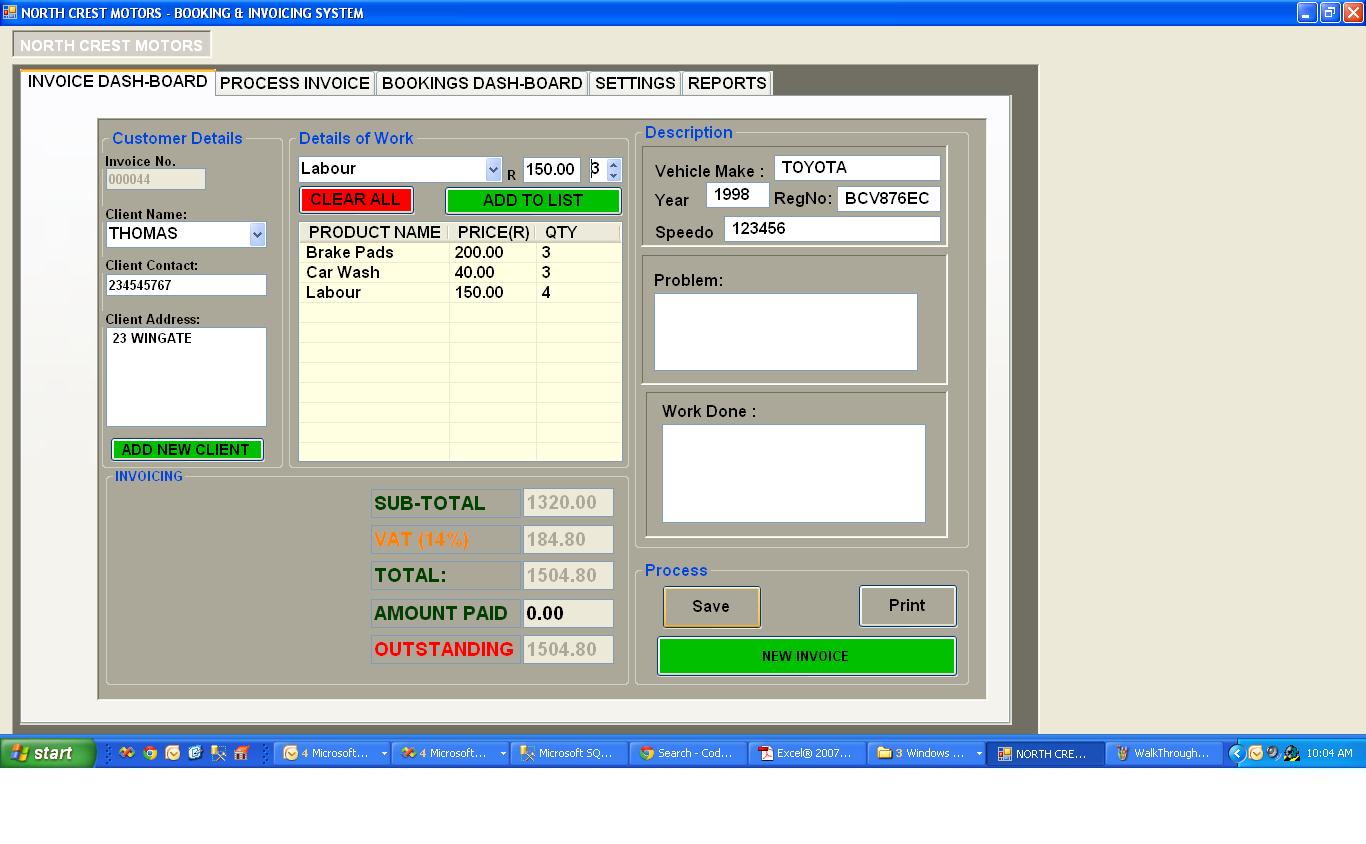 An Invoice Tracking System, I wrote for my Dad's mechanic workshop a few years ago. Use of Crytal Reports, User Controls, Datasets, SQl2005. Attach the backup Database to sql 2005 Manager.