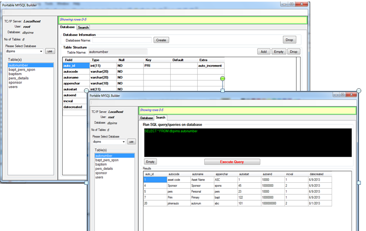 The Portable MySQL Builder application is created using Visual Basic 2008 express edition and MySQL Database for database support. This application allows to create a database without using command prompt, and you can also create your MySQL database tables using this application, view the structure of your MySQL database and it has a MySQL Query Browser feature.