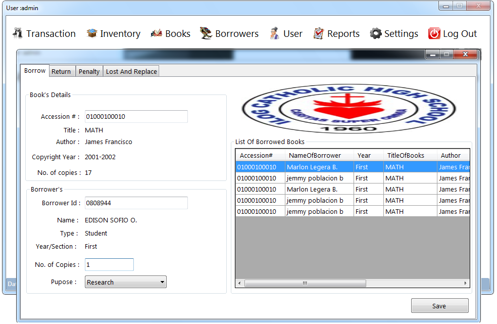 • Transaction (Borrow Books, Return Books, Penalty and Lost and Replacement of books).